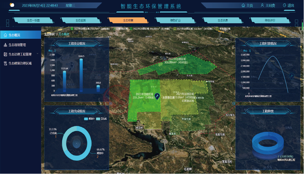 14.綜合評價:實現(xiàn)環(huán)保-生態(tài)數(shù)據(jù)融合,在綜合分析大屏上整體展現(xiàn)當(dāng)前礦區(qū)的環(huán)保效益,展現(xiàn)出當(dāng)前礦區(qū)生態(tài)監(jiān)測的“空天地”一體化信息、生態(tài)修復(fù)的規(guī)劃、實施及階段性 “減排、增益”目標(biāo)成果等內(nèi)容。