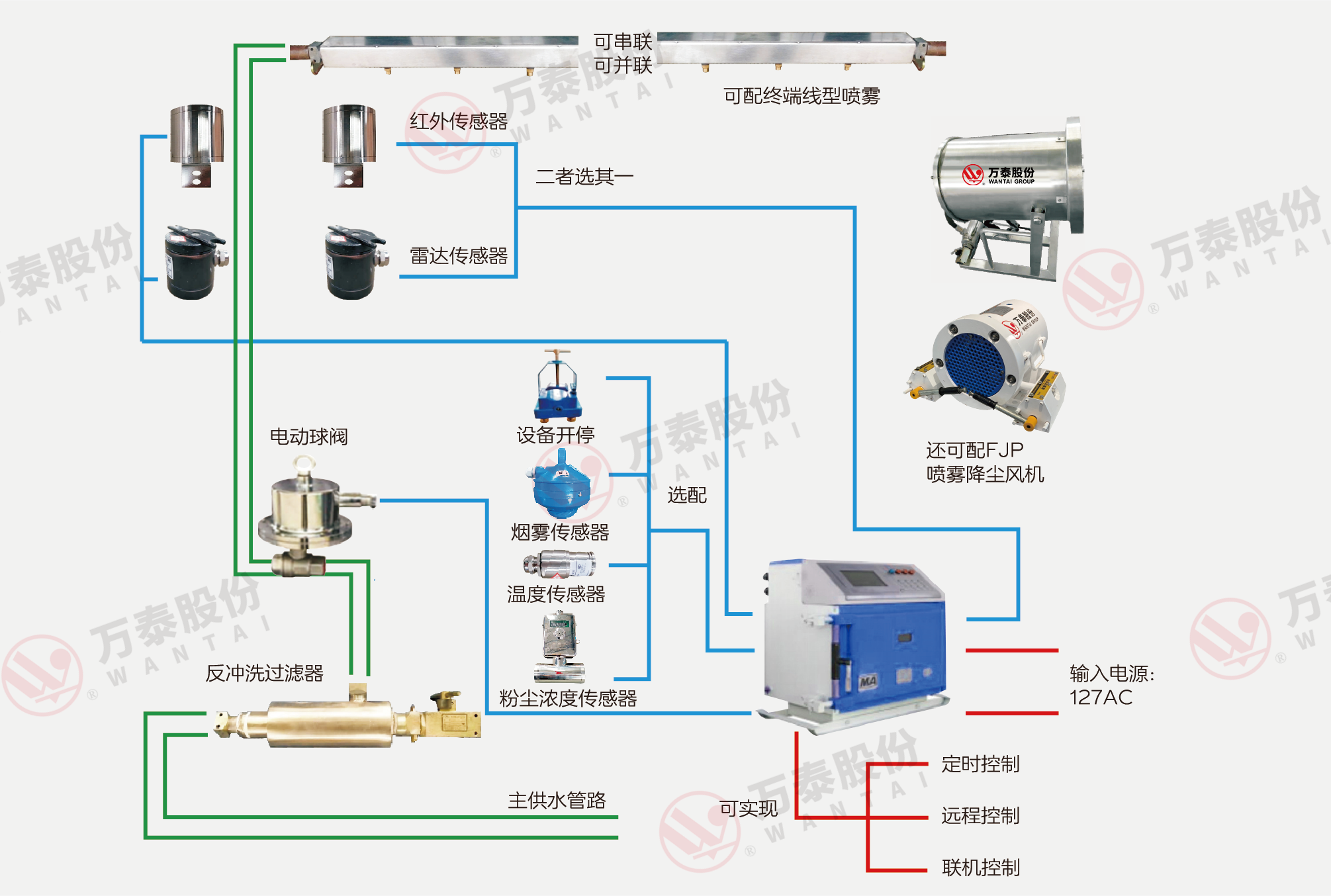 2. 防塵水幕:實現(xiàn)PLC多種控制自動噴霧,有車輛人員感應(yīng)控制,人或車輛走近時停止噴霧,離開時自動噴霧。粉塵濃度控制、溫度控制、瓦斯?jié)舛瓤刂频取?/span>