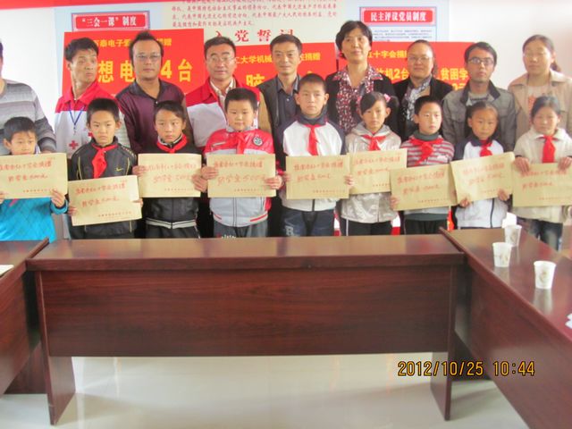 此次捐贈(zèng)的對(duì)象主要是金寨縣果子園鄉(xiāng)佛堂坳村小學(xué)。早上6:30,來自社會(huì)各界的愛心人士都齊集淮南紅十字會(huì),隨后踏上了我們的愛心之旅,經(jīng)過長(zhǎng)達(dá)3個(gè)多小時(shí)的路途,終于在上午10:40,到達(dá)了目的地。此時(shí),學(xué)校的孩子們、老師們?cè)缫丫奂谛@里,熱情的歡迎我們的到來,眼睛里充滿了感激之情。看到這一幕,大家都深深的震撼了,更加堅(jiān)定了我們傳遞愛心的信念。此次募捐活動(dòng),大家共帶去了5萬(wàn)多元的錢和物。其中包括紅十字會(huì)和93學(xué)社共同捐贈(zèng)的多媒體一體機(jī)和打印機(jī)1套,萬(wàn)泰愛心基金會(huì)捐贈(zèng)的聯(lián)想電腦4臺(tái),安徽理工大學(xué)捐贈(zèng)的電腦2臺(tái)以及紅十字會(huì)和93學(xué)社為20名特困小學(xué)生捐助的每人500元的慰問金等。在捐贈(zèng)現(xiàn)場(chǎng),果子鄉(xiāng)的各級(jí)領(lǐng)導(dǎo)表達(dá)了他們對(duì)我們的感激之情,并激勵(lì)孩子們一定要克服困難,好好學(xué)習(xí),為改變自己、改變大山而努力。
