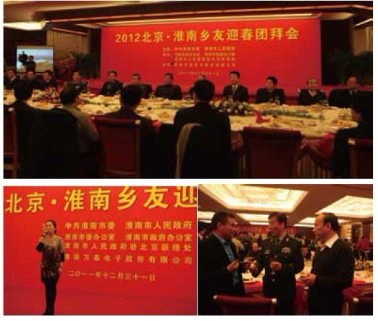 2011年12月30日,由中共淮南市委、市政府、 淮南市人民政府駐北京聯(lián)絡處主辦,淮南萬泰電子股份有限公司協(xié)辦的2012北京?淮南鄉(xiāng)友迎春團拜會在首都北京中國職工之家酒店隆重召開,由中共淮南市委書記楊振超主持,市長曹勇致辭,邀請了原武警總部副司令、中將陳傳闊,中國社會科學院副院長李楊,國務院參事室黨組成員副主任王為民等鄉(xiāng)友代表做精彩發(fā)言。